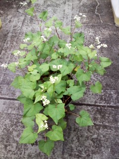花は普通そばより小さく、数輪が顔を寄せ合うように集まって清楚に咲いています。葉はきれいな緑色で、なんとハートの形をしていて可愛くオシャレです。