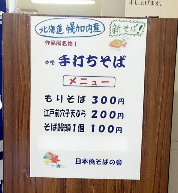 日本橋社会教育会館では、手芸、絵画、着付け、料理など数多くの文化活動が行われおり、その成果を披露する場として毎年「作品展」が開催されます。今年も11月6日から4日間開催され、我が「日本橋そばの會」も11月7日(金)に出店しました。料理系サークルは料理教室を交代で使うため、残念ながら出店は1日だけ、しかも平日でしたので集客が心配されましたが、結果的には杞憂でした。私自身は初参加で恐縮なのですが、出店録を記させて頂きます。