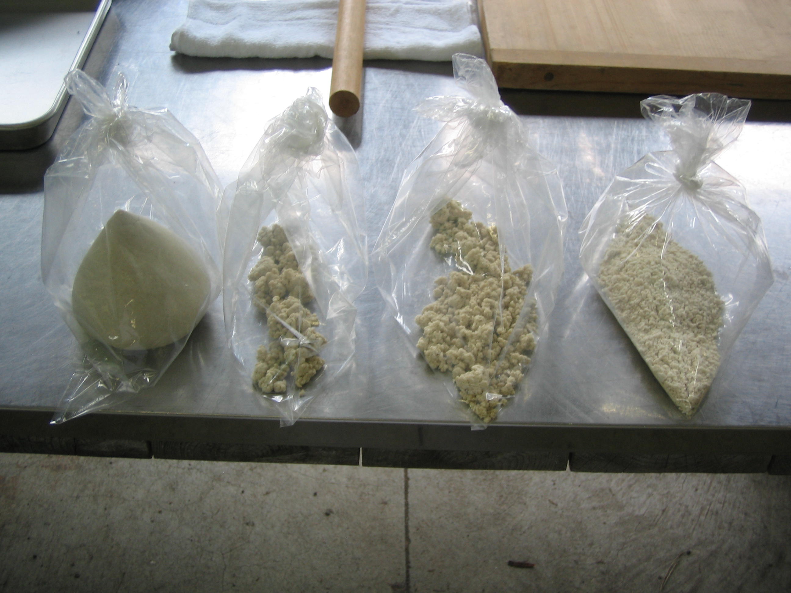 水回しは飽きてしまうので少しずつ変わっていく粒のサンプルを作り、回して近くで見てもらいました。やはり四つ出しで丸から四角に変わった時は「ワー!」といって喜んでくれました。途中、子供たちに「上手だね」と褒めてもらい、「何年やっているの?」「15年そば打ちをしているのよ」「それじゃあ今何歳なの?」「何歳に見える?」「45歳!」なんて何とも楽しい会話をしながら進めました。「さあみんなもやってみよう!」と言うとクモの子を散らすように班に戻りワイワイとこね始めました。