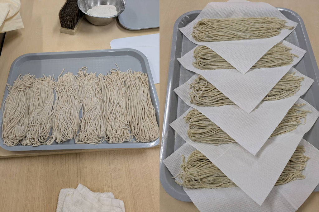 菊を練り込んだ変わりそばに挑戦されている方、加水不足だったのでしょうか固く締まっていました。写真は途中で最後は、もっと表面を整えました。こういう楽しみ方も良いですね。