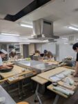 今日はそば打ち台4台を四方向かい合わせに設置しました。お互いのそば打ちが見られ、また調理台の上に乗せたそば打ち台よりも足が台の下に入り込めるため身体全体の動きがスムーズに踏み出せるようになりました。
